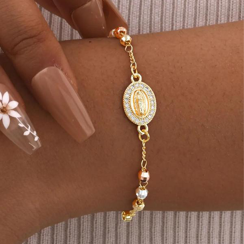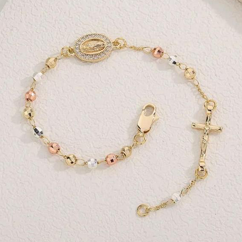 СИМВОЛИЧНИ ОБЕЦИ – Тази гривна е украсена с детайлен кръст и блестящ медальон с камъчета, като е елегантно изражение на вярата и придава на стила ви изискан и смислен акцент.